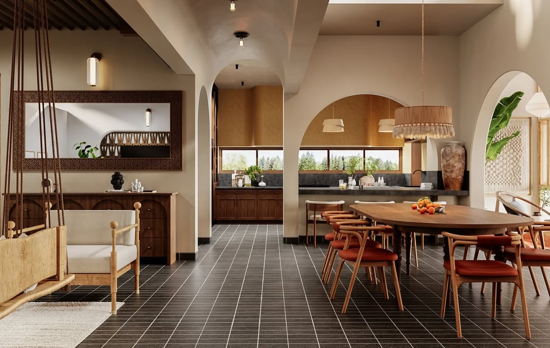 Warna hitam sering kali menjadi pilihan pertama ketika mencari keramik lantai yang mampu menyamarkan debu, kotoran, dan noda ringan. Selain itu, warna ini memberikan kesan elegan, modern, dan timeless. Cocok untuk berbagai gaya interior, mulai dari minimalis hingga etnik. Contohnya, ruang keluarga yang dirancang oleh YUUGA Architectural Studio menggunakan keramik lantai hitam dengan furnitur kayu klasik, menciptakan suasana yang hangat namun tetap modern.