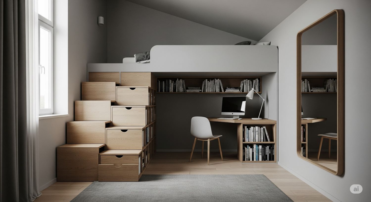 Apabila kamu punya kamar dengan atap tinggi, konsep tempat tidur bertingkat bisa menjadi ide menarik. Ranjang diposisikan di bagian atas (tingkat), dilengkapi tangga yang memiliki rak dalam bentuk laci untuk menyimpan barang-barang ekstra. Bagian bawah ranjang ini dapat difungsikan sebagai zona belajar ataupun area penyimpanan lebih banyak lagi. Menambahkan cermin besar pada tembok lawan dari jendela juga cukup ampuh buat mencerminkan sinaran matahari serta memberi kesan luas pada kamarmu. Keuntungan terbesarnya ialah mengoptimalkan ketinggian ruangan tersebut; sangat sesuai bagi pemuda maupun orang dewasa muda yang butuh daerah privat dan multifungsi.