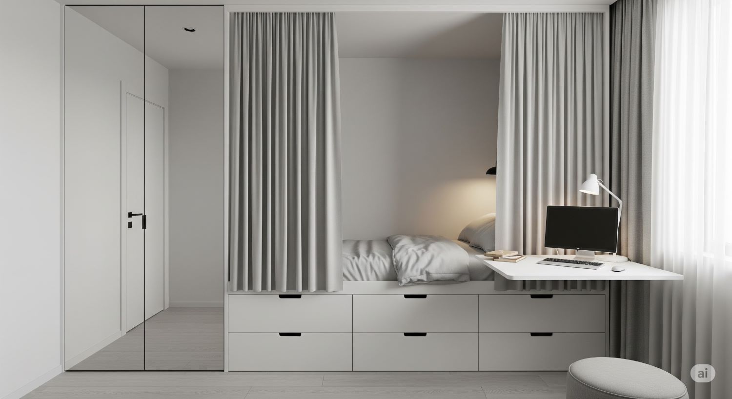 4. Rancangan Ruang Tidur yang Memanfaatkan Meja Kerja Di Bawah Ranjang
