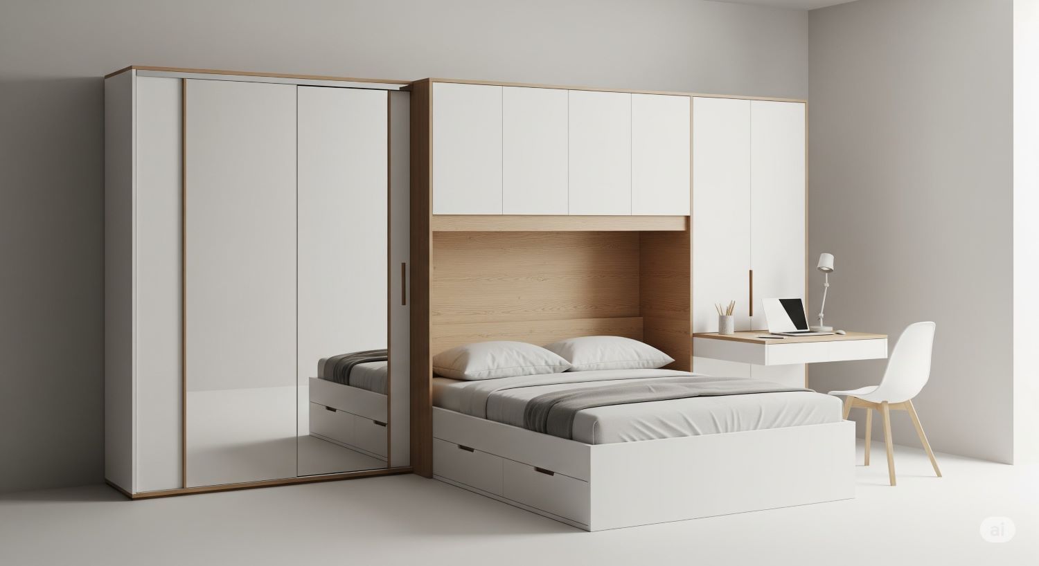 Konsep desain ini sempurna bagi Anda yang memiliki kamar berukuran kecil. Poin pentingnya adalah tempat tidur dari kayu dengan rangka empat laci besar di bagian bawah, berguna sebagai area tambahan untuk menyimpan pakaian atau perabotan pribadi. Untuk mengoptimalkannya, ada sebuah meja tulis fleksibel yang dipasangkan pada dinding dan bisa dikembalikan ketika tak sedang digunakan sehingga membantu menjaga kesegelan ruangan. Juga termasuk dalam paket tersebut adalah cermin panjang disamping lemari yang bukan saja multifungsi namun juga menciptakan efek visual membuat ruangan tampak lebih luas. Manfaat utama model ini yaitu irit lahan serta masih cukup lapang untuk dilewati, benar-benar sesuai untuk mereka yang punya kamarku kecil.