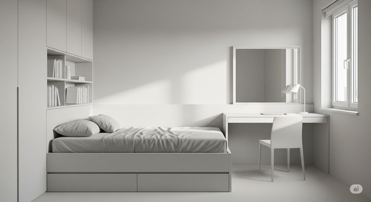 Kunci dari desain minimalis adalah pemilihan warna. Pada konsep ini, warna putih mendominasi sehingga ruangan tampak lebih cemerlang dan lapang. Kursi berbentuk lemari dengan tempat penyimpanan di bagian bawah serta rak buku di sisi kepala menciptakan penampilan yang apik dan serba guna. Diujung kasur juga dilengkapi meja tulis menempel ke dinding, disertai cermin besar diatasnya untuk membangun zona kerja efektif. Manfaat utamanya ialah semua komponen saling melengkapi satu sama lain, memberikan nuansa bersih, moderen, dan sangat terstruktur.