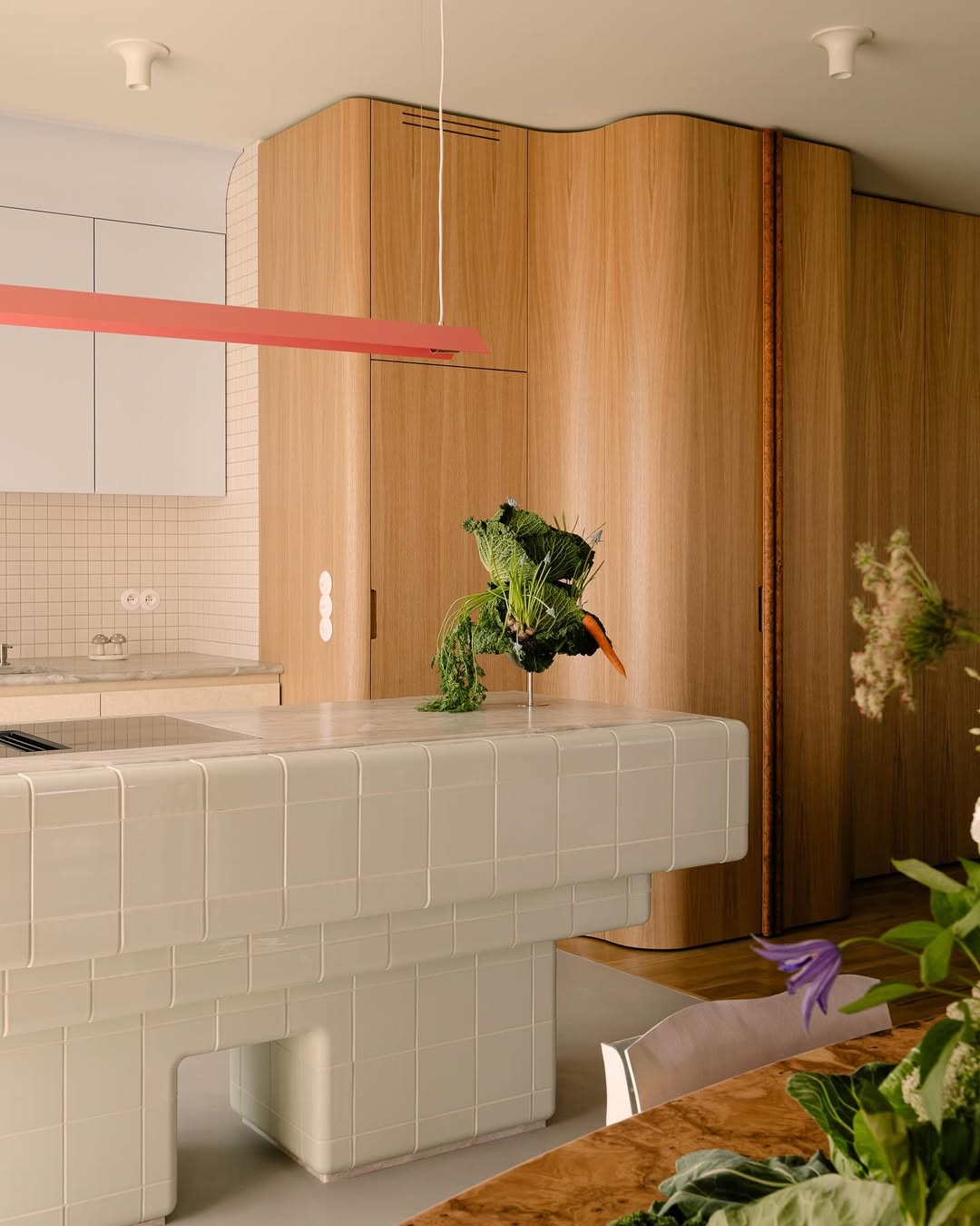 Ketika memasuki apartemen ini, perhatian langsung tertuju pada dapur terbuka dengan kitchen island yang luas. Lantai dapur dilapisi ubin berwarna krem pucat yang mengkilap, menjadi daya tarik utama sekaligus tempat Rozkoszyny berkarya. Di atas kompor induksi terdapat lampu gantung tipis berwarna pink yang berpadu harmonis dengan kabinet kuning mentega yang memberikan nuansa hangat dan ringan.