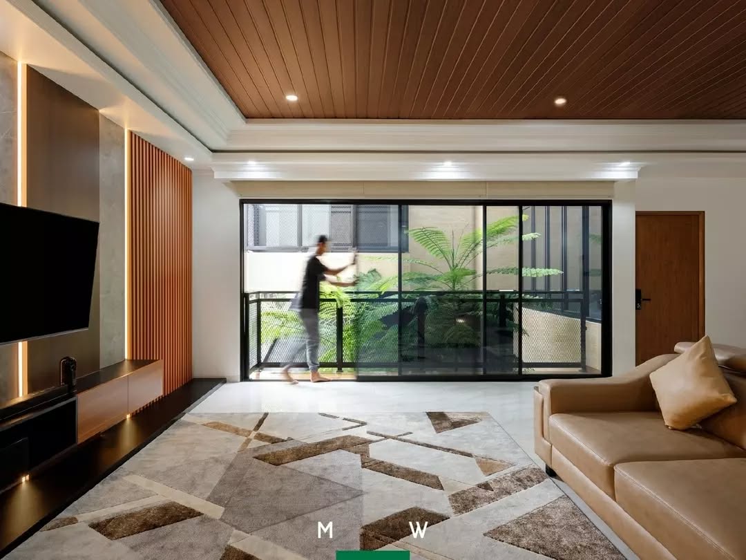 Konsep desain berlapis sederhana ini ideal untuk area besar seperti ruang tamu. Meskipun tetap minimalis, namun tampilannya menjadi mewah dan menambah kedalaman visual di ruangan yang ekstra lebar.