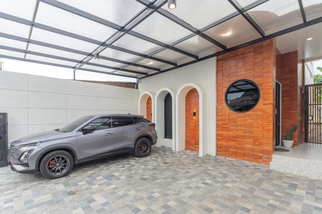Pintu geser jenis bifold dalam warna hitam membuka akses ke carport yang luas mampu menampung dua mobil. Pencahayaan alami sangat optimal berkat penggunaan atap transparan yang memungkinkan cahaya matahari masuk ke seluruh area. Dinding aksen bata ekspos serta jejeran aksen pintu arch memberikan kesan menarik pada area ini. Konsep lengkung juga terlihat pada jendela kaca berbentuk lingkaran di sisi pintu arch.