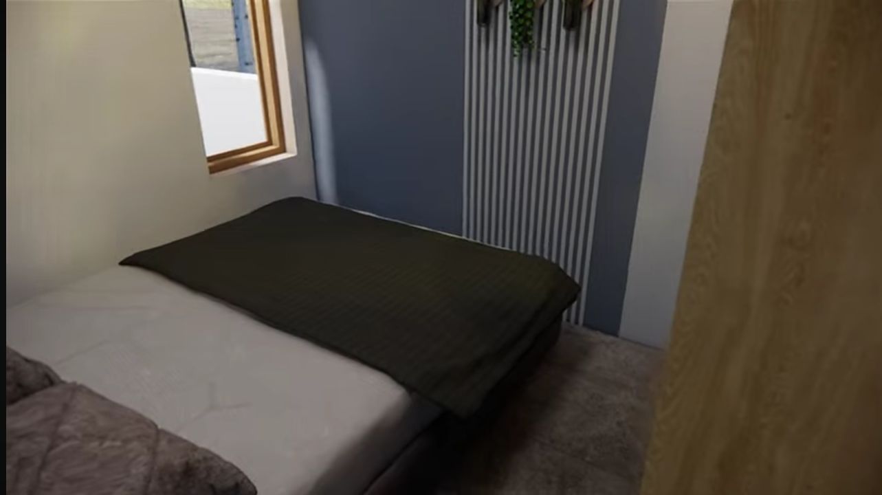 Kamar utama dirancang minimalis, hanya berisi tempat tidur ukuran sedang serta lemari dua pintu, dengan jendela yang mengarah ke zona cuci mencuci di bagian belakang rumah.